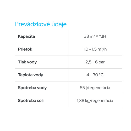 Inteligentná regenerácia- Pomocou mikroprocesora a presného vodomeru (sledovanie prietoku už od 2 l/min) je spotreba vody priebežne monitorovaná. Riadiaca hlava podľa toho nastavuje čas regenerácie tak, aby ste nikdy nezostali bez zmäkčenej vody.
