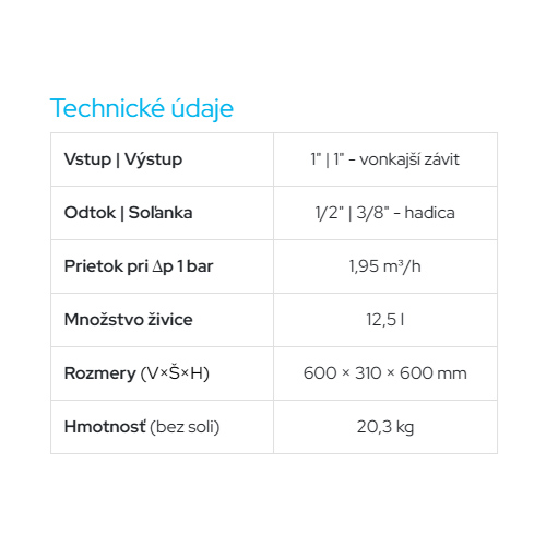 Mäkká voda v soľankovej nádrži- Do soľankovej nádrže sa dopúšťa upravená voda, čo znižuje spotrebu soli a zvyšuje účinnosť regenerácie.